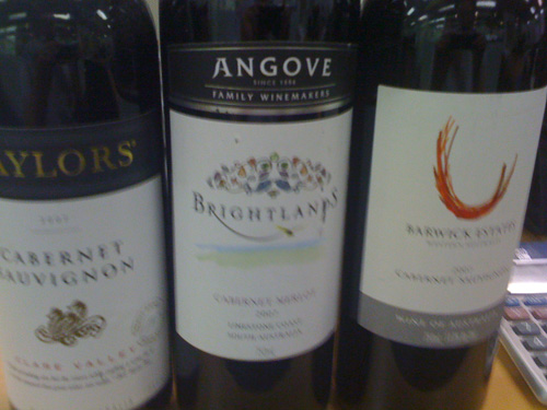 Just for interest, today I opened up 3 Cabernet based wines, all from the 2007 vintage, all available for $15 a bottle (though the Angoves & the Taylors have a higher RRP), from 3 different regions.