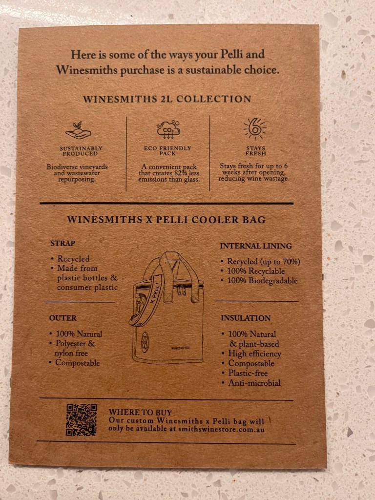 You can’t see from my crap photos, but under the Winesmiths brand, this is intended to make casks even more convenient (and fun). That brown bag is part of a collab range of Winesmiths x Pelli range of cooler bags, encouraging you to proudly take casks to parties rather than hide them like a dirty secret.