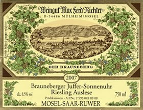 Max Ferd Richter Brauneberger Juffer Riesling Kabinett 2007 (Mosel, Germany)Screwcap, $37, 8.5%I've included a picture of the label (though this is for the Sonnenuhr Auslese) just so we can all …